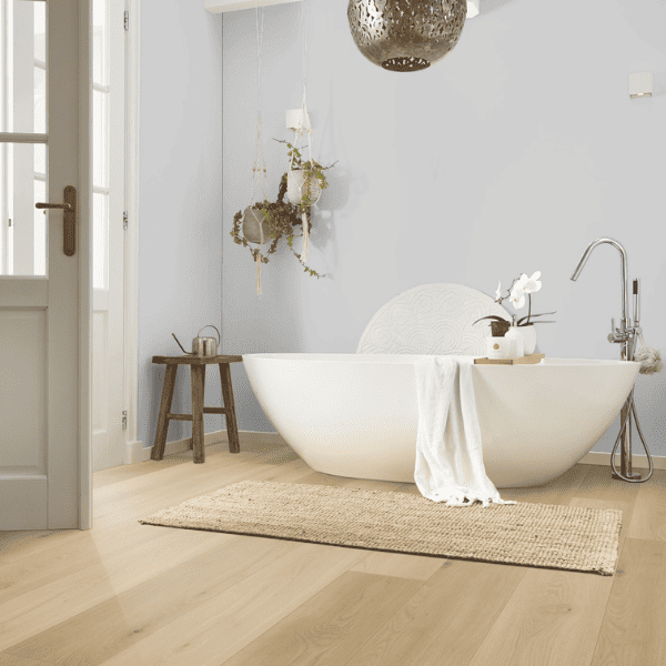 Ce revêtement de sol résistant à l’eau convient parfaitement aux pièces humides comme la salle de bains (classe A0) et aux sols chauffés par circuits d’eau chaude.